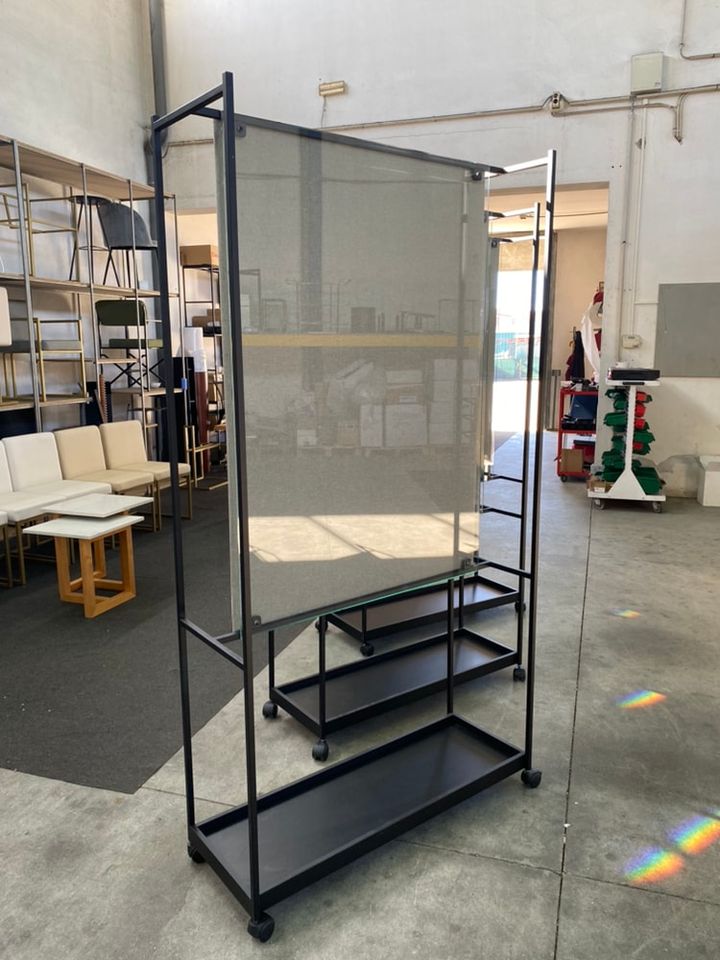 Face com vidro transparente Face com painel estofado tecido fuamizado Tabuleiro inferior com fundo madeira 4 rodas