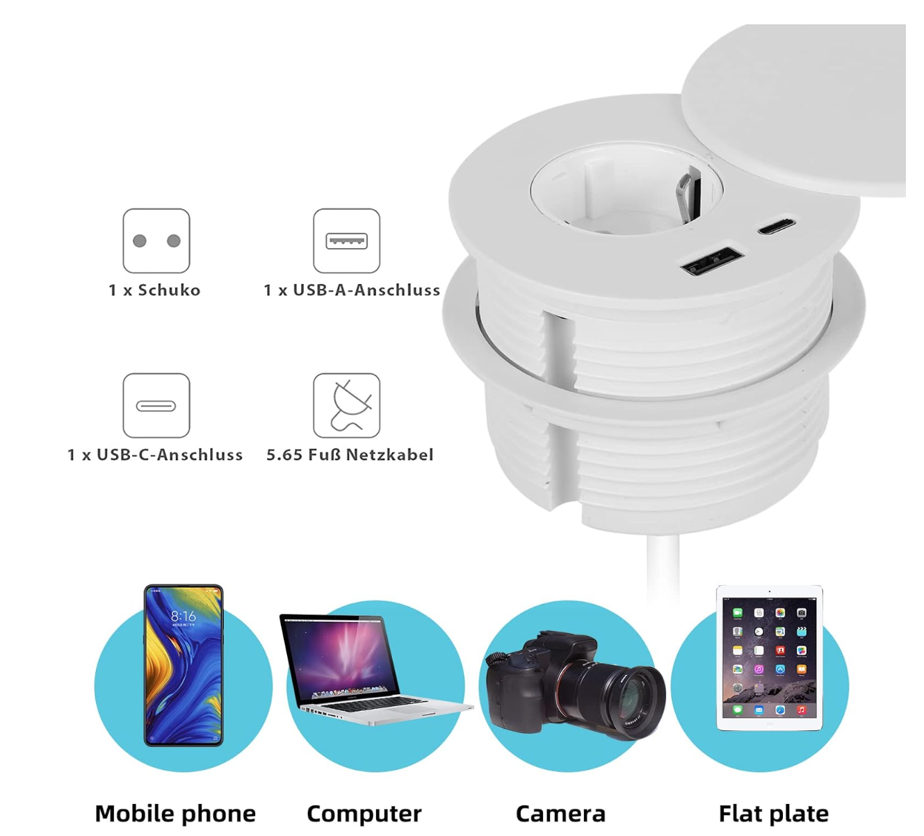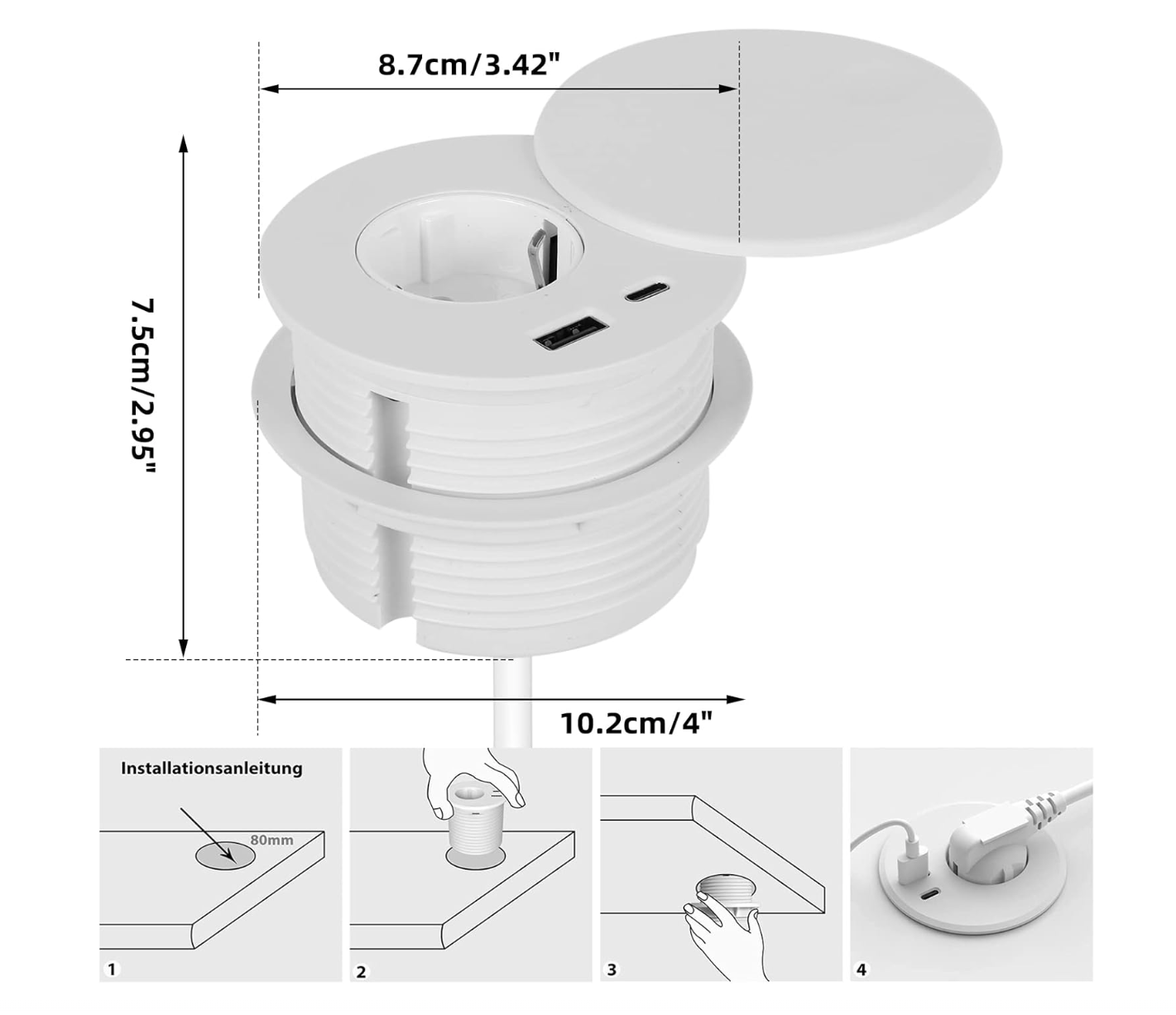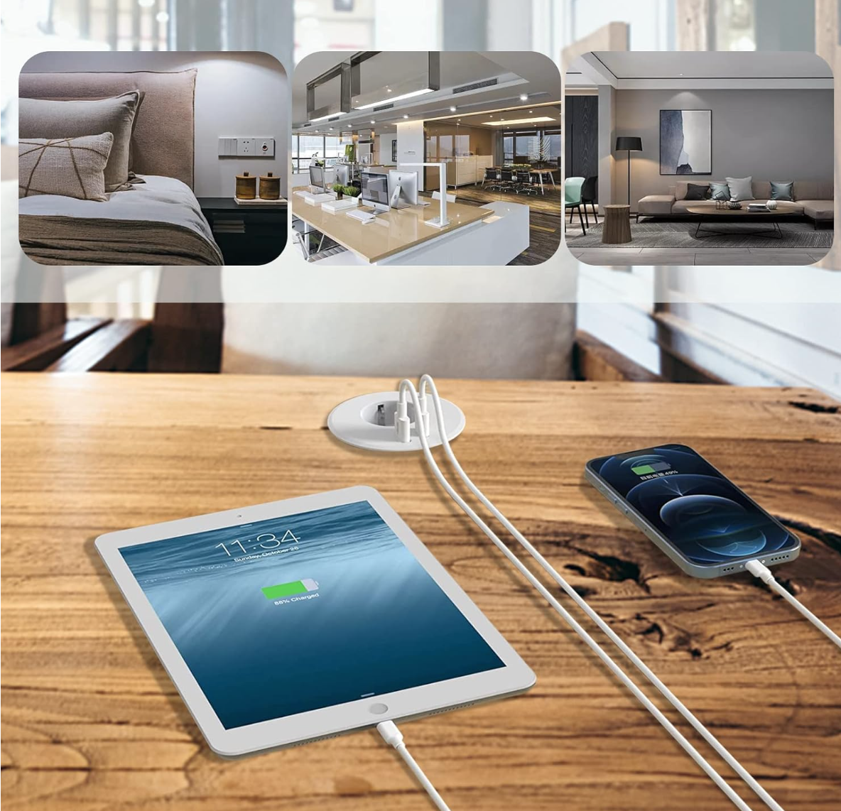 Tomada embutida com USB-C e USB-A