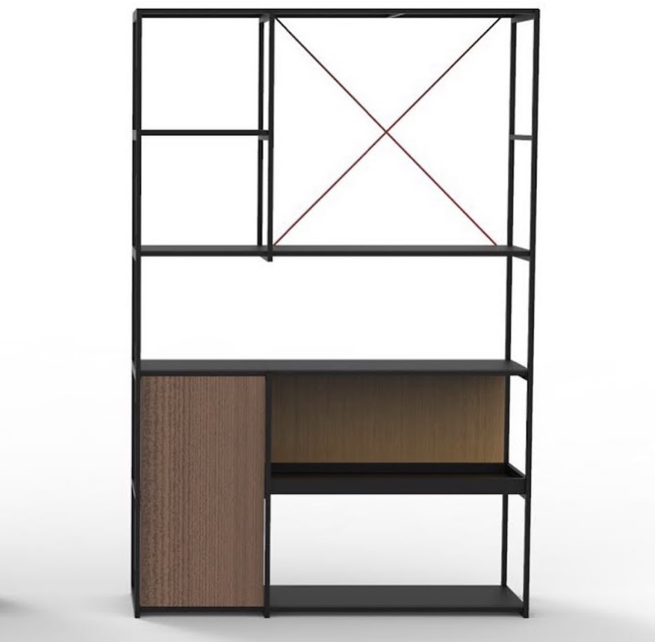 prateleiras em melamina preto modulo com prota em melamina carvalho costa em melamina carvalho tensor x vermelho estrutura metalica preto