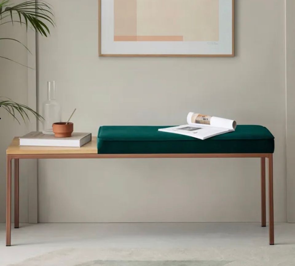 Assento estofado em tecido @gabrielfabrics Tampo madeira Estrutura metálica