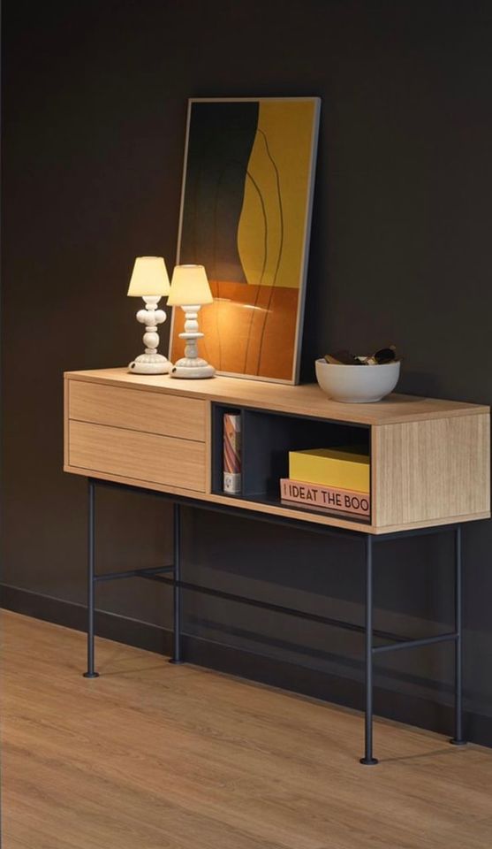 Módulo madeira exterior Melamina Cor carvalho Módulo interior madeira lacada Estrutura metálica ferro lacado